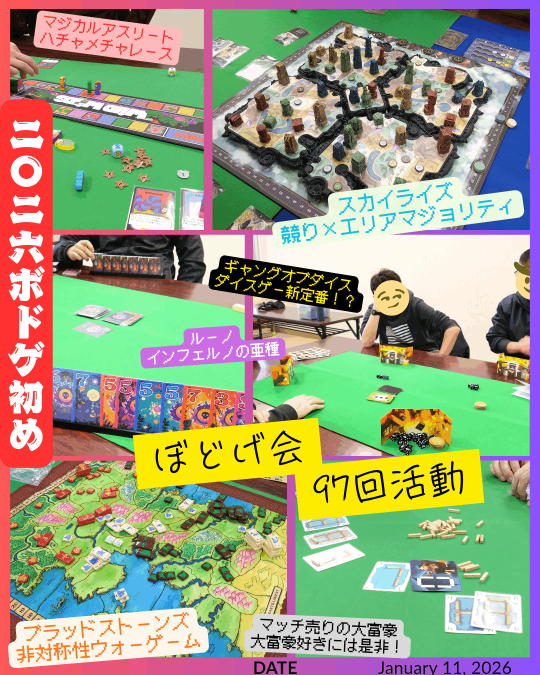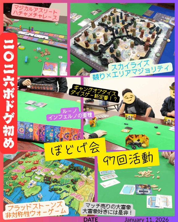 今回、私の卓では、ルーノ、マジカルアスリート、ブラッドストーンズ、贋作画家ベルラッティ、マッチ売りの大富豪、スカイライズなどが開かれました。特に、メンバーに持ち込みいただいたスカイライズは素晴らしかった。圧倒的コンポーネントによるビジュアルだけで100点なのに、そのゲーム性も非常によくできていて、アブストラクト好きはマストバイかも!?